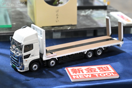 日野プロフィア低床4軸セルフローダーの試作モデルが展示されてる様です。